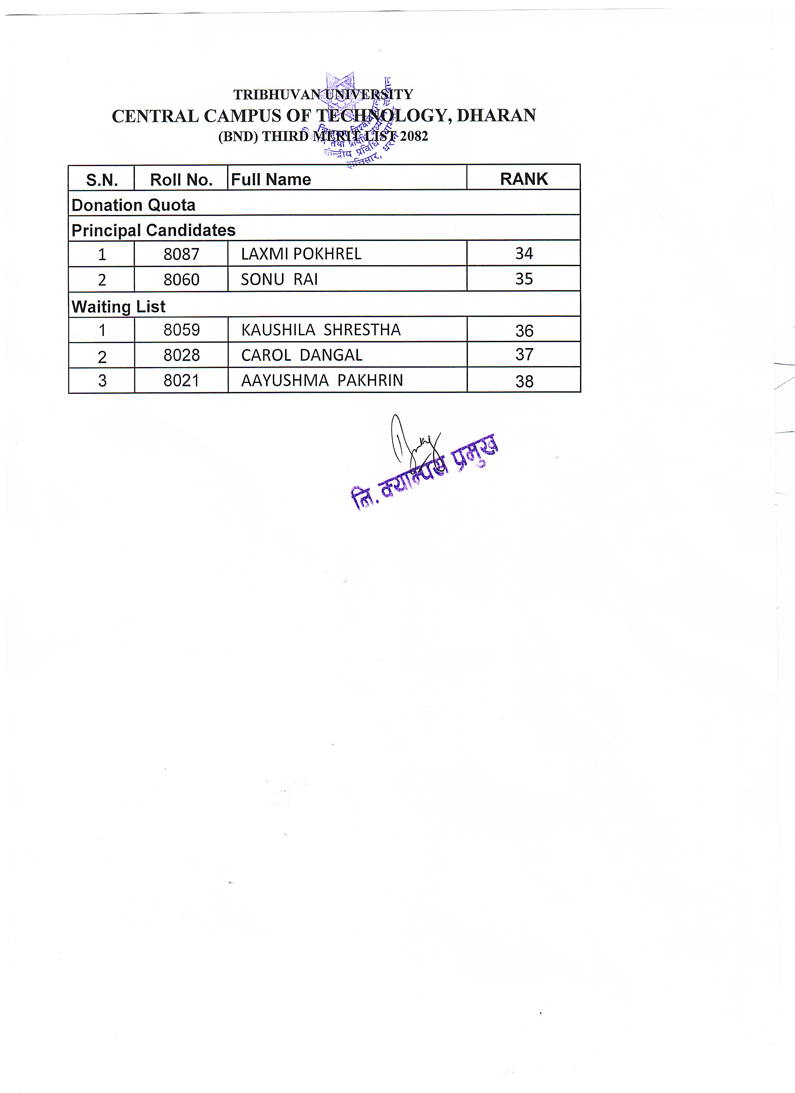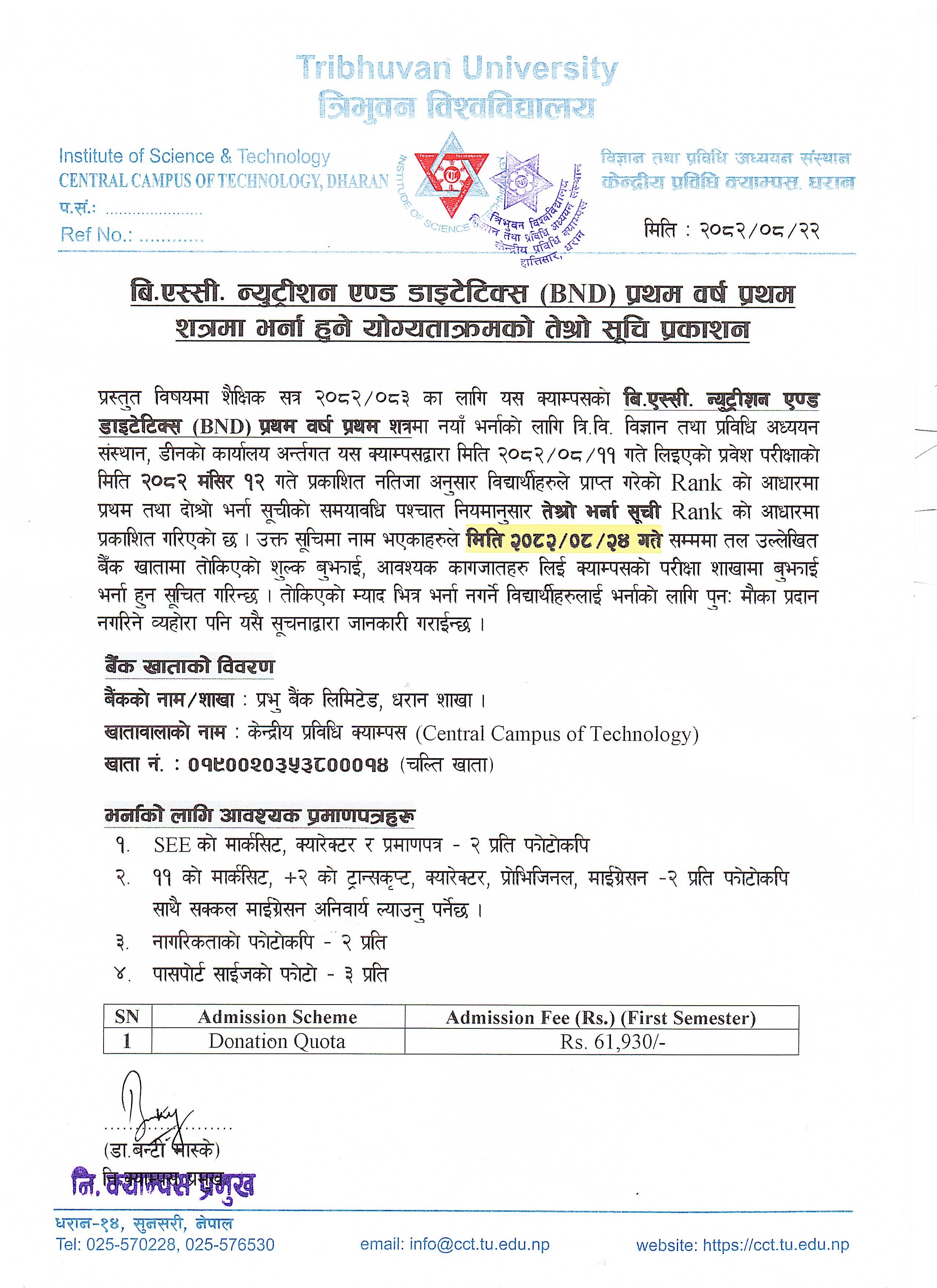 B.Sc. Nutrition & Dietetics First Year First Semester Third Admission Merit list 2082