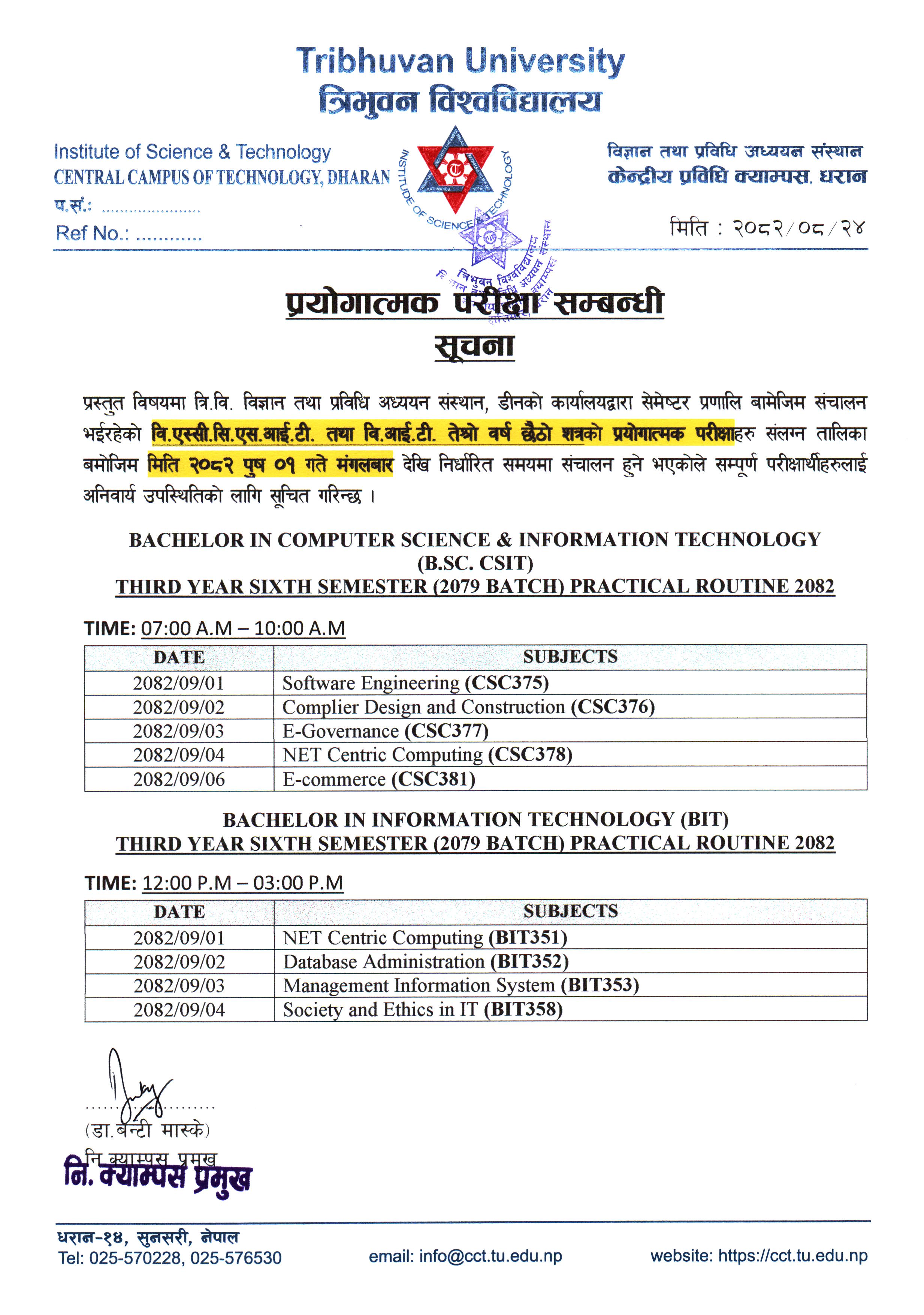वि.एस्सी.सि.एस.आई.टी. तथा वि.आई.टी. तेश्रो वर्ष छैठो शत्रको प्रयोगात्मक परिक्षा बारे सूचना २०८२