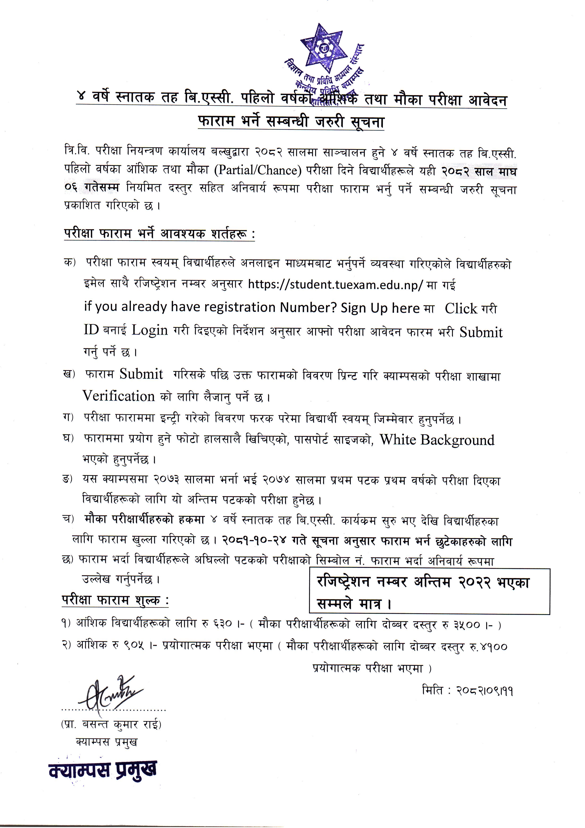 ४ वर्ष स्नातक तह बि.एस्सी. पहिलो वर्षको आंशिक तथा मौका परिक्षा आवेदन फारम भर्ने सम्बन्धी जरुरी सूचना ।