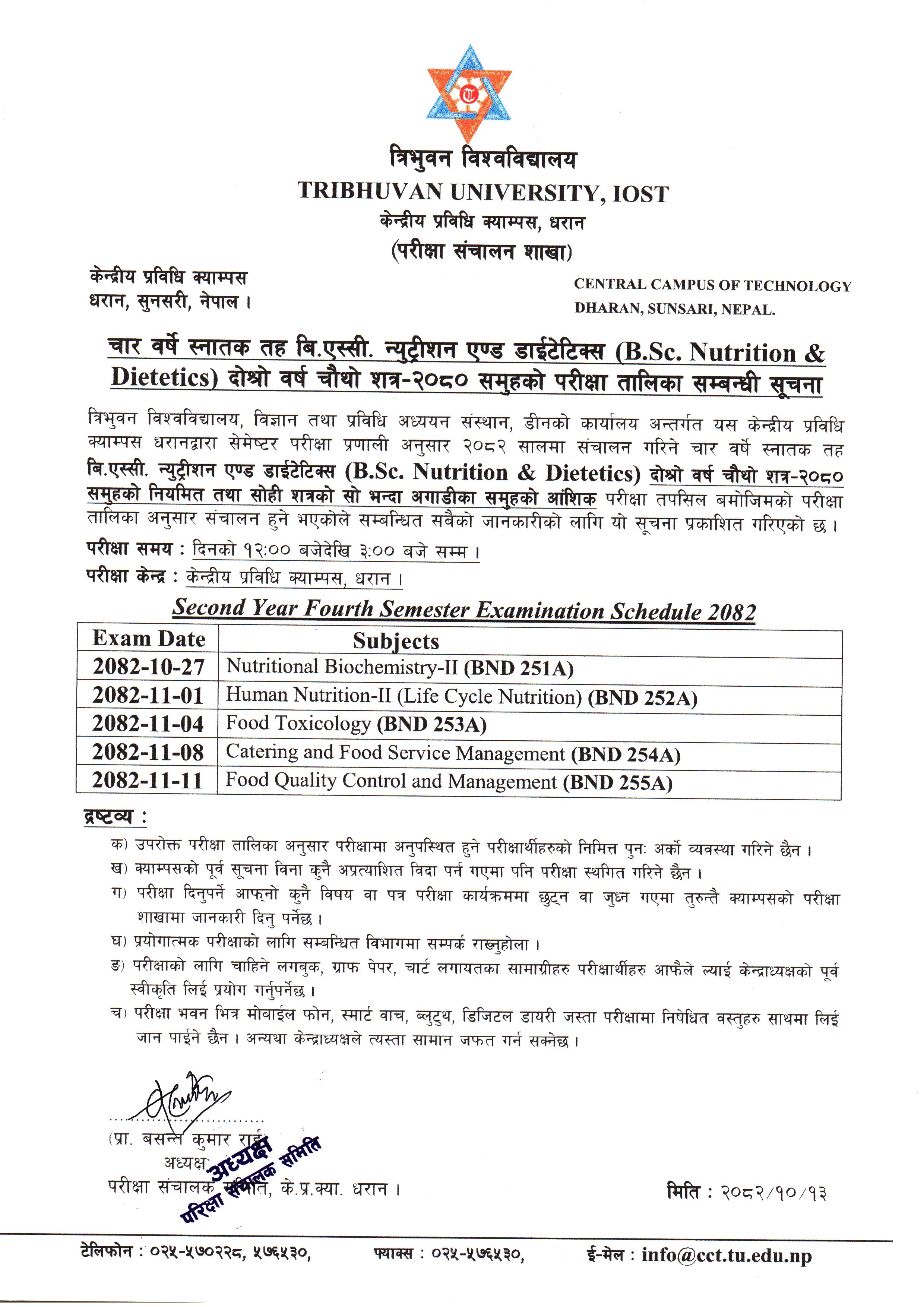 चार वर्ष स्नातक तह बि.एस्सी. न्युट्रीशन एण्ड डाईटेटिक्स (B.Sc. Nutrition & Dietetics) दोश्रो वर्ष चौथो शत्र-२०८० समुहको परिक्षा तालिका सम्बन्धी सूचना ।
