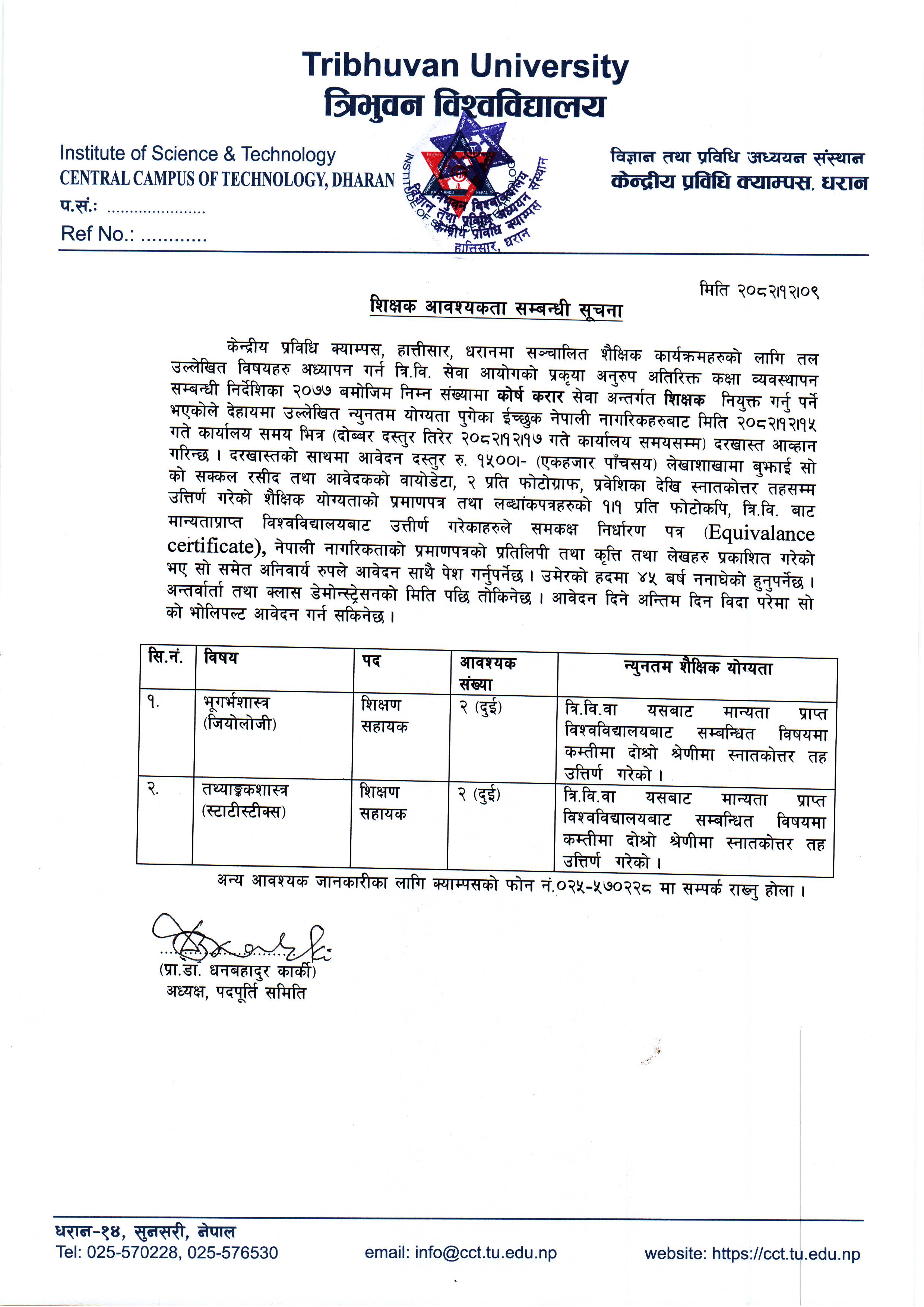 शिक्षक आवश्यकता सम्बन्धी सूचना ।