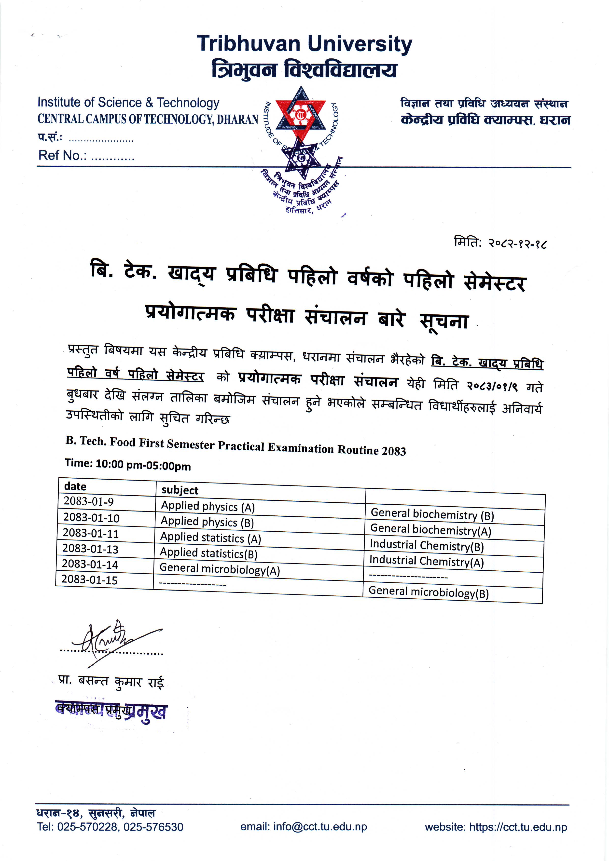 बि.टेक. खाद्य प्रविधि प्रथम वर्ष प्रथम शत्रको प्रयोगात्मक परिक्षा बारे सूचना ।