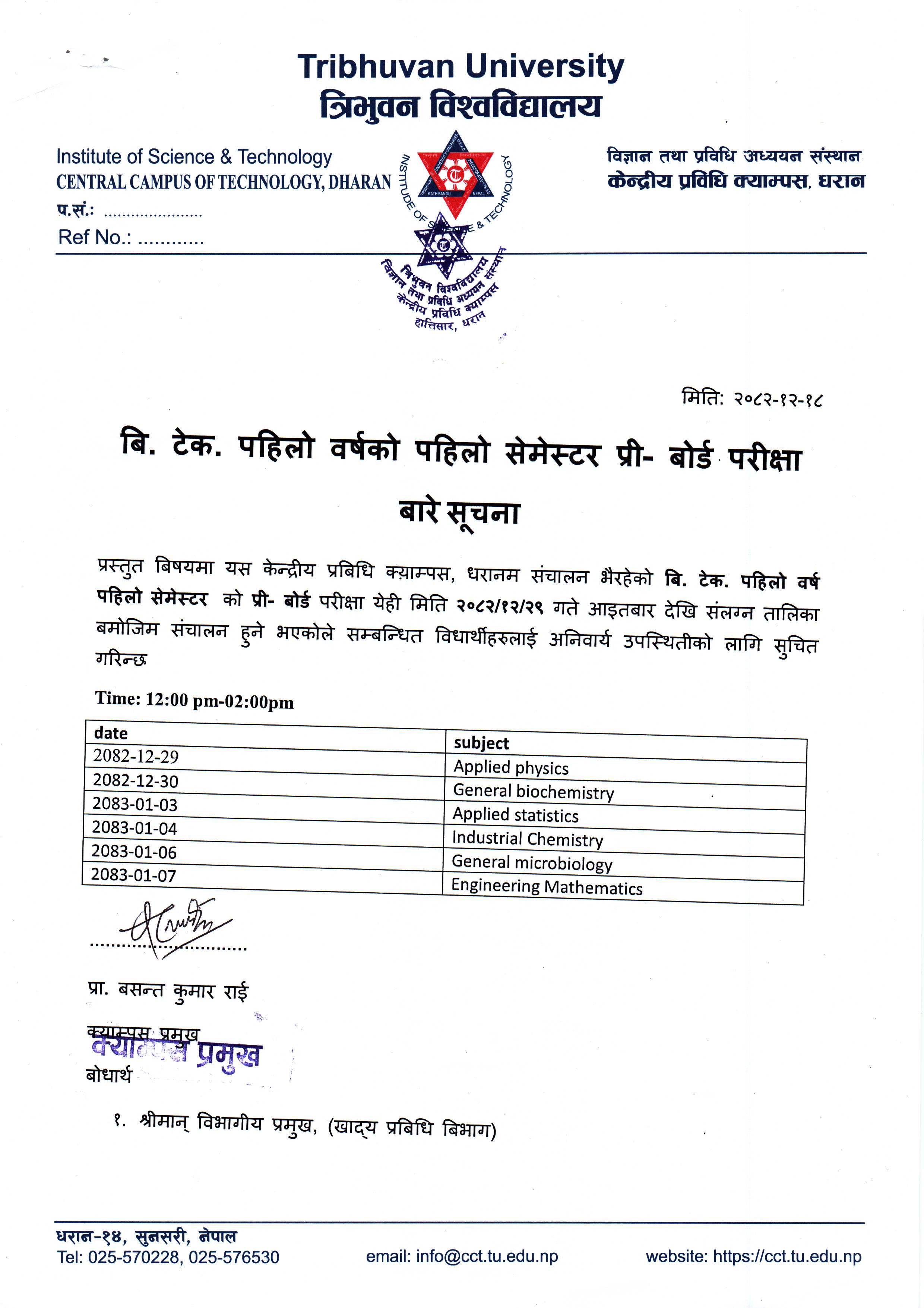 बि.टेक. खाद्य प्रविधि प्रथम वर्ष प्रथम शत्रको प्री-बोर्ड परिक्षा बारे सूचना ।