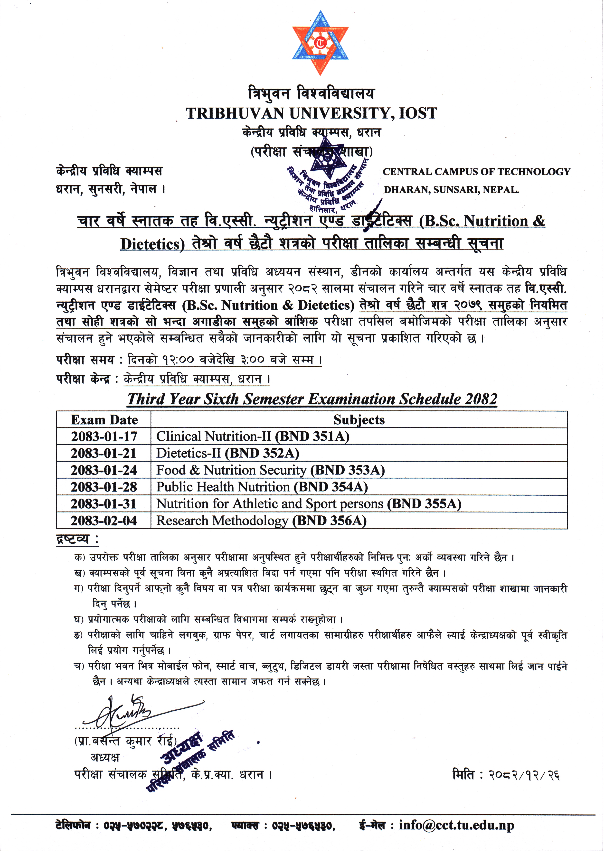 चार वर्षे स्नातक तह वि.एस्सी. न्युट्रीशन एण्ड डाईटेटिक्स (B.Sc. Nutrition & Dietetics) तेश्रो वर्ष छैटौ शत्रको परीक्षा तालिका सम्बन्धी सूचना ।