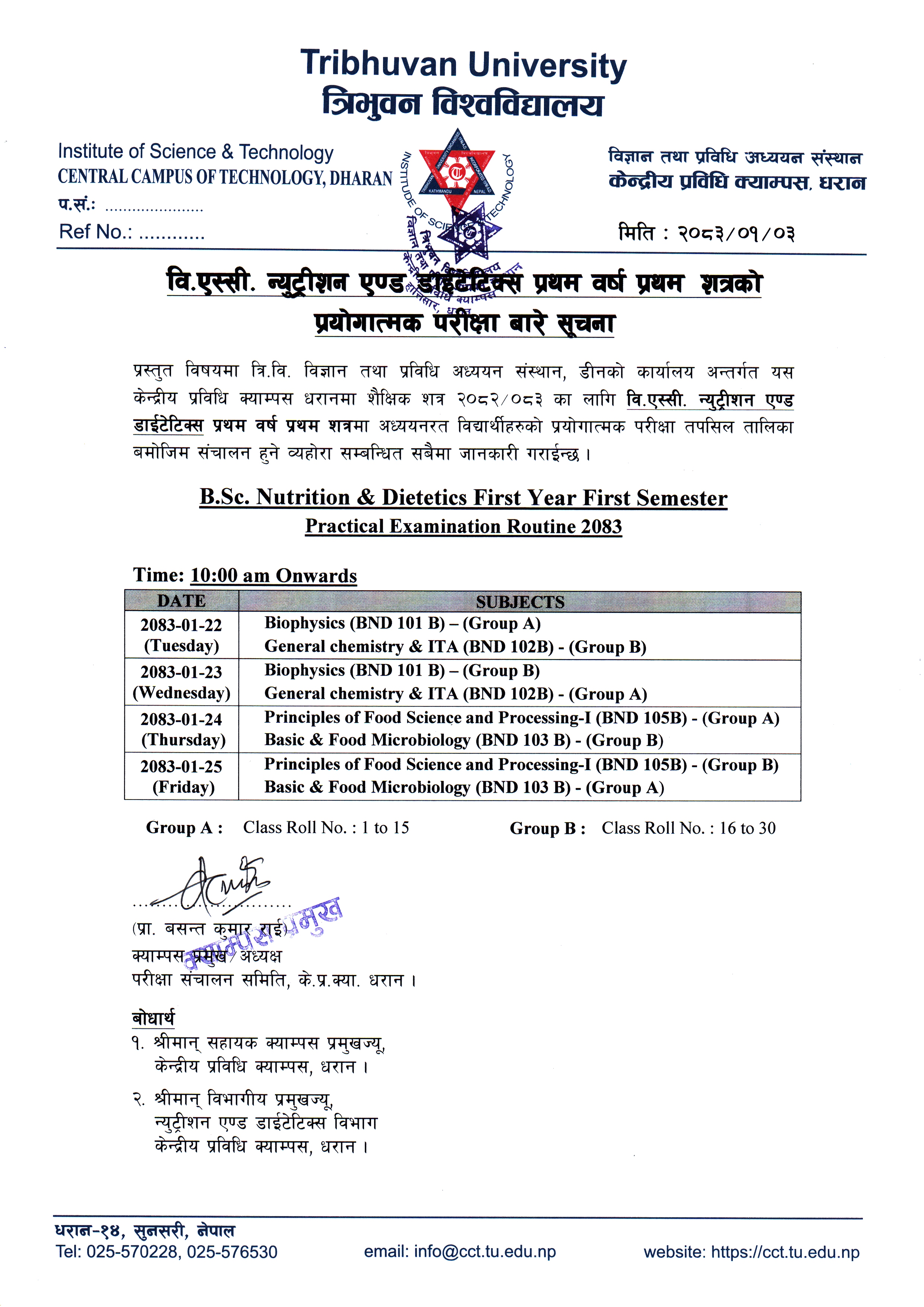 बि.टेक. खाद्य प्रविधि प्रथम वर्ष प्रथम शत्रको प्रयोगात्मक परिक्षा बारे सूचना ।