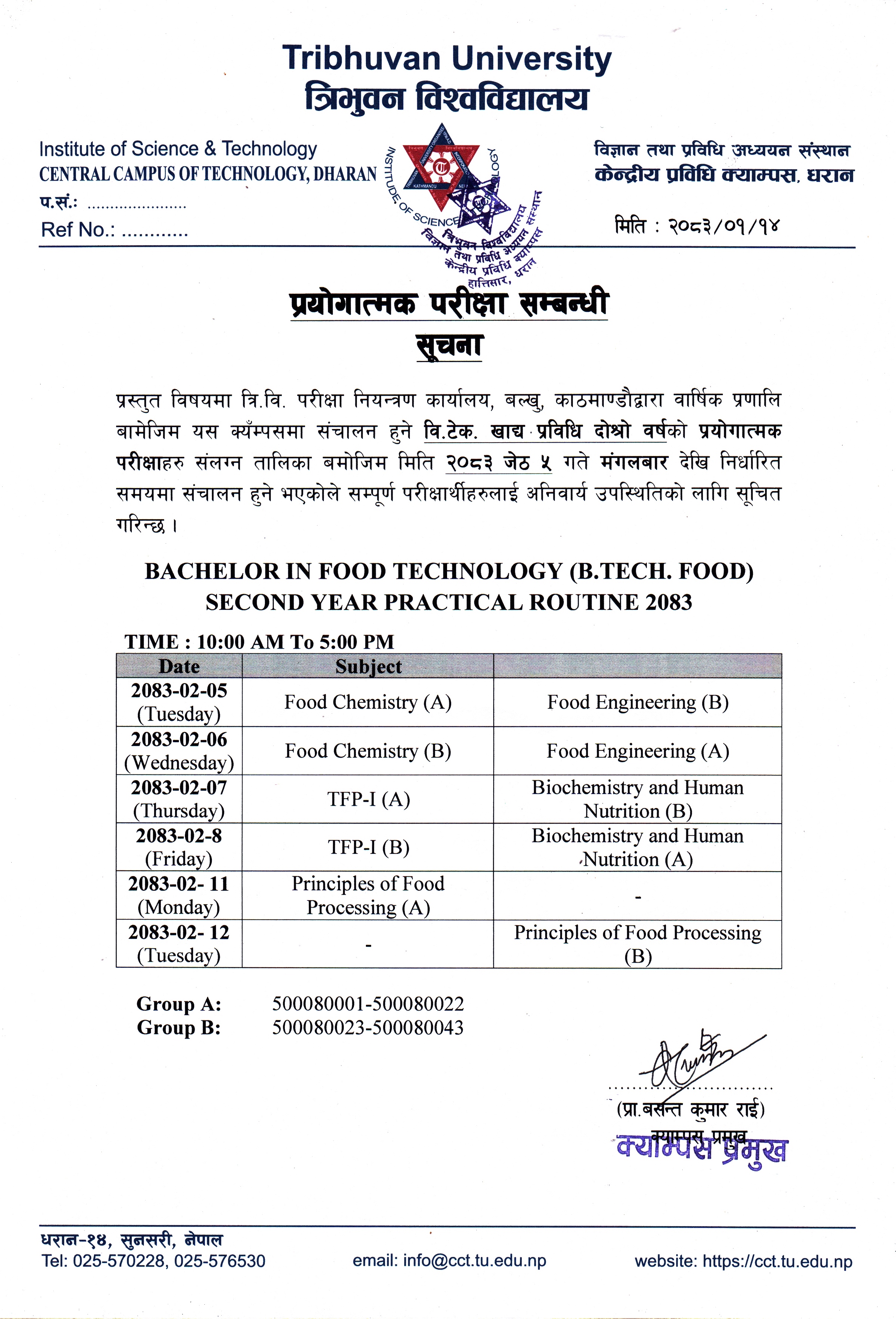 बि.टेक. खाद्य प्रविधि प्रथम वर्ष प्रथम शत्रको प्रयोगात्मक परिक्षा बारे सूचना ।