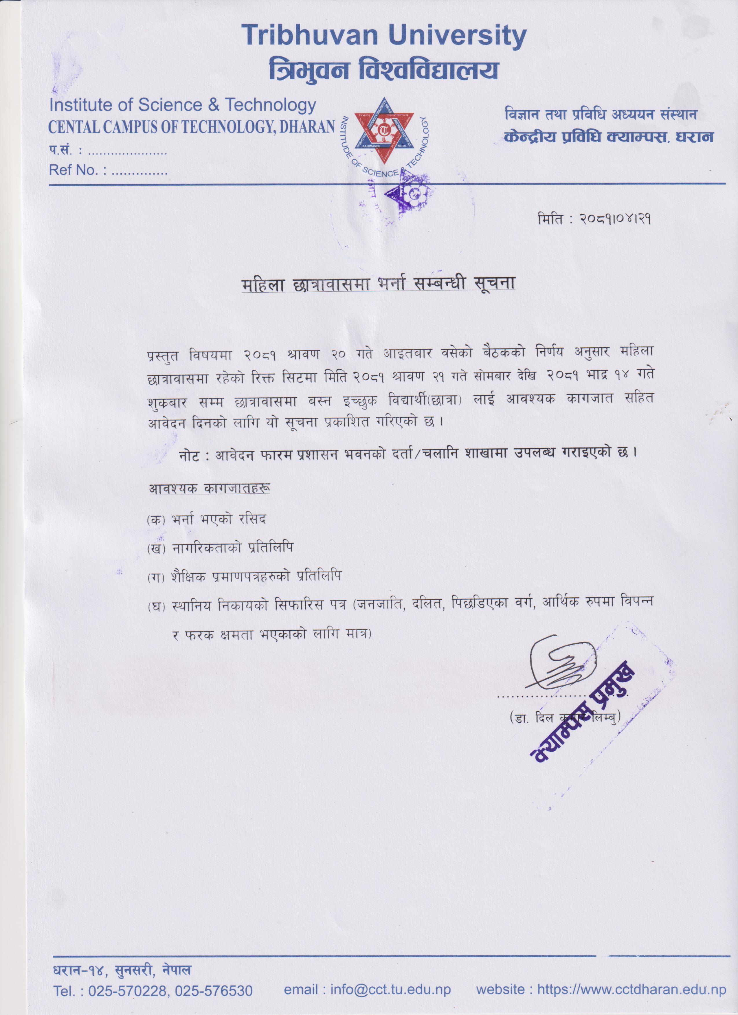महिला छात्रावसमा भर्ना सम्बन्धि सूचना