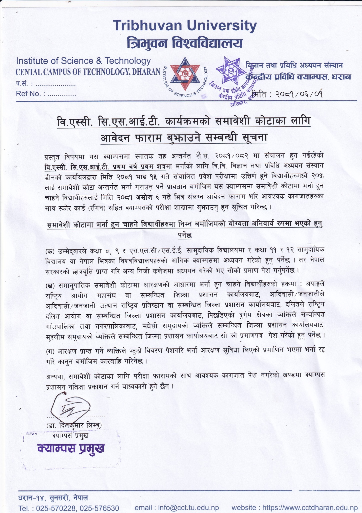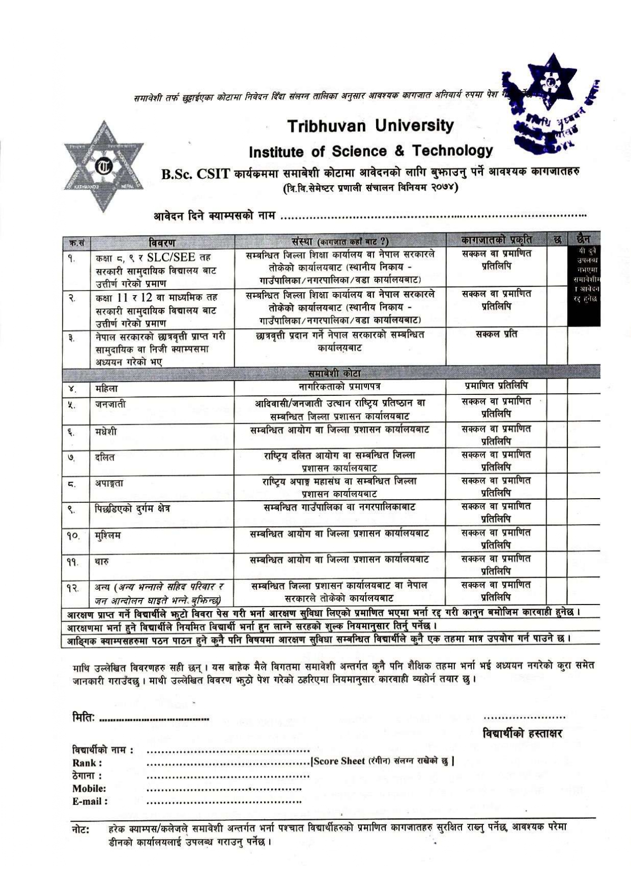 B.Sc. CSIT काे समावेशी काेटाका लागी अावेदन फारम submit गर्ने बारे सुचना