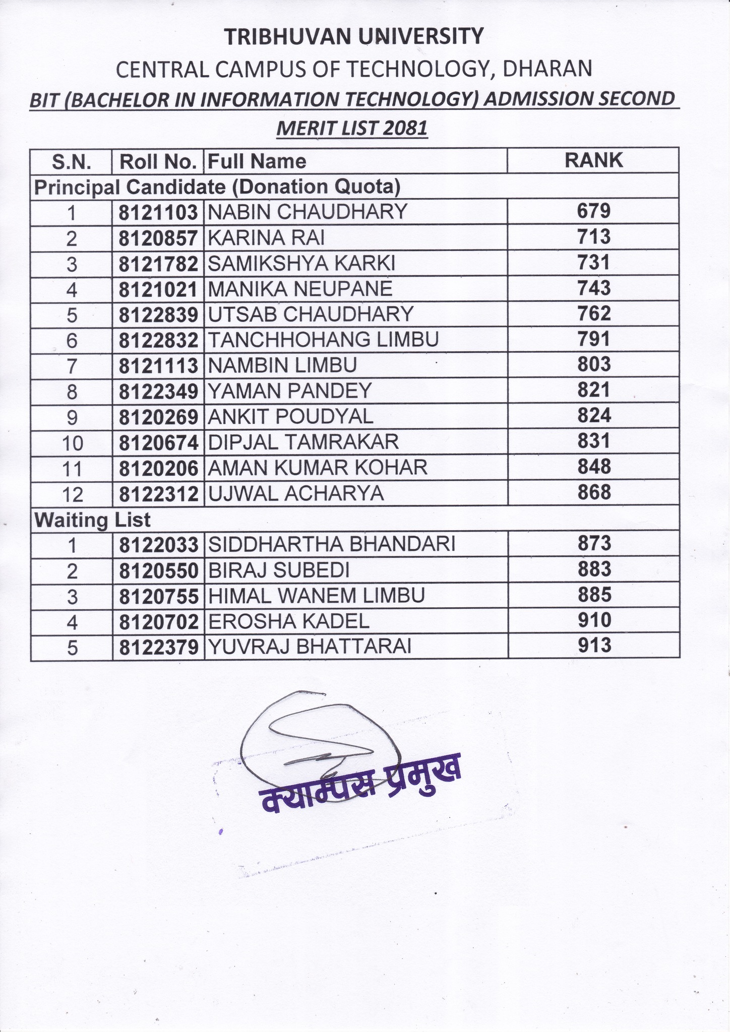 BIT Second Admission Merit List 2081