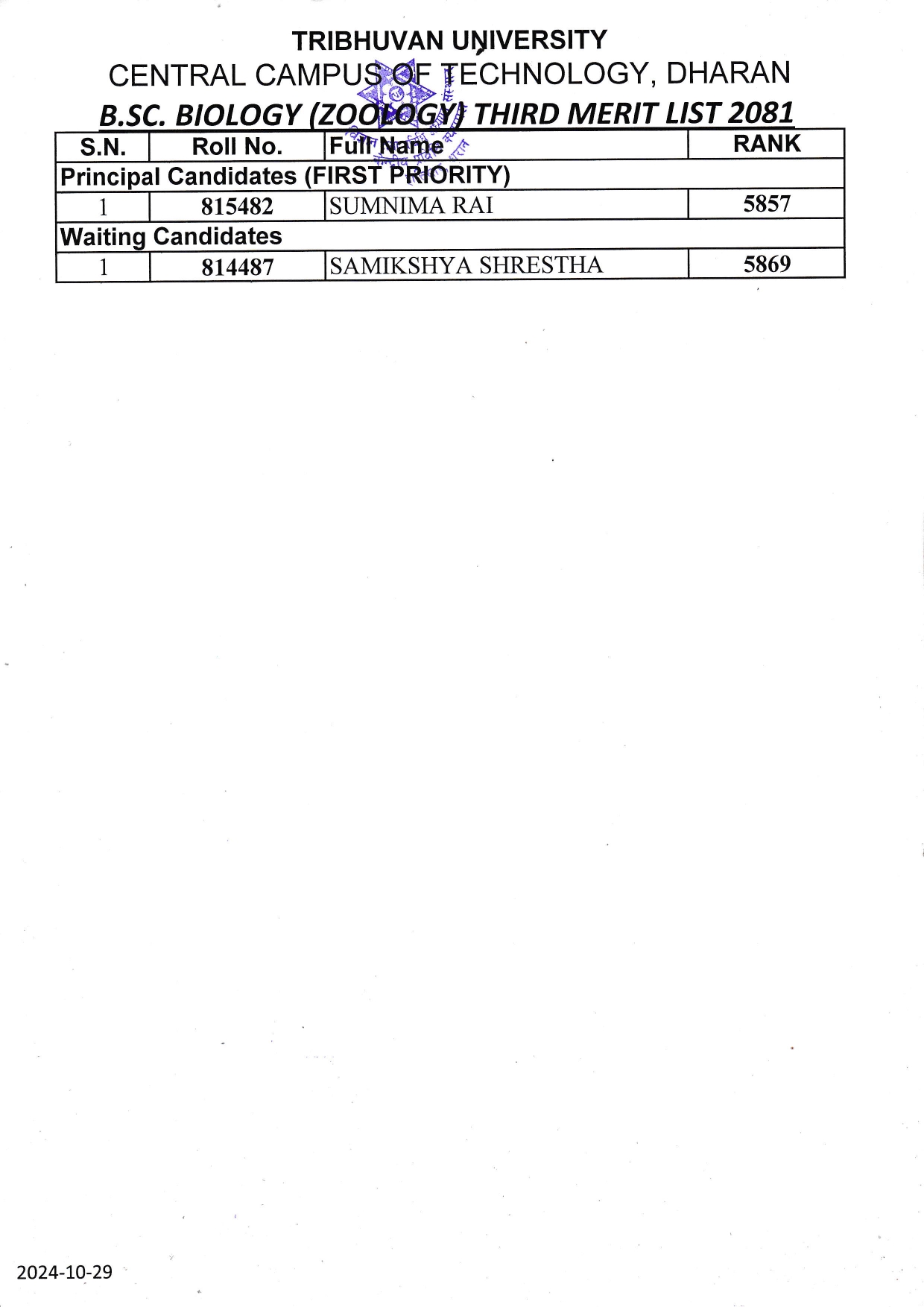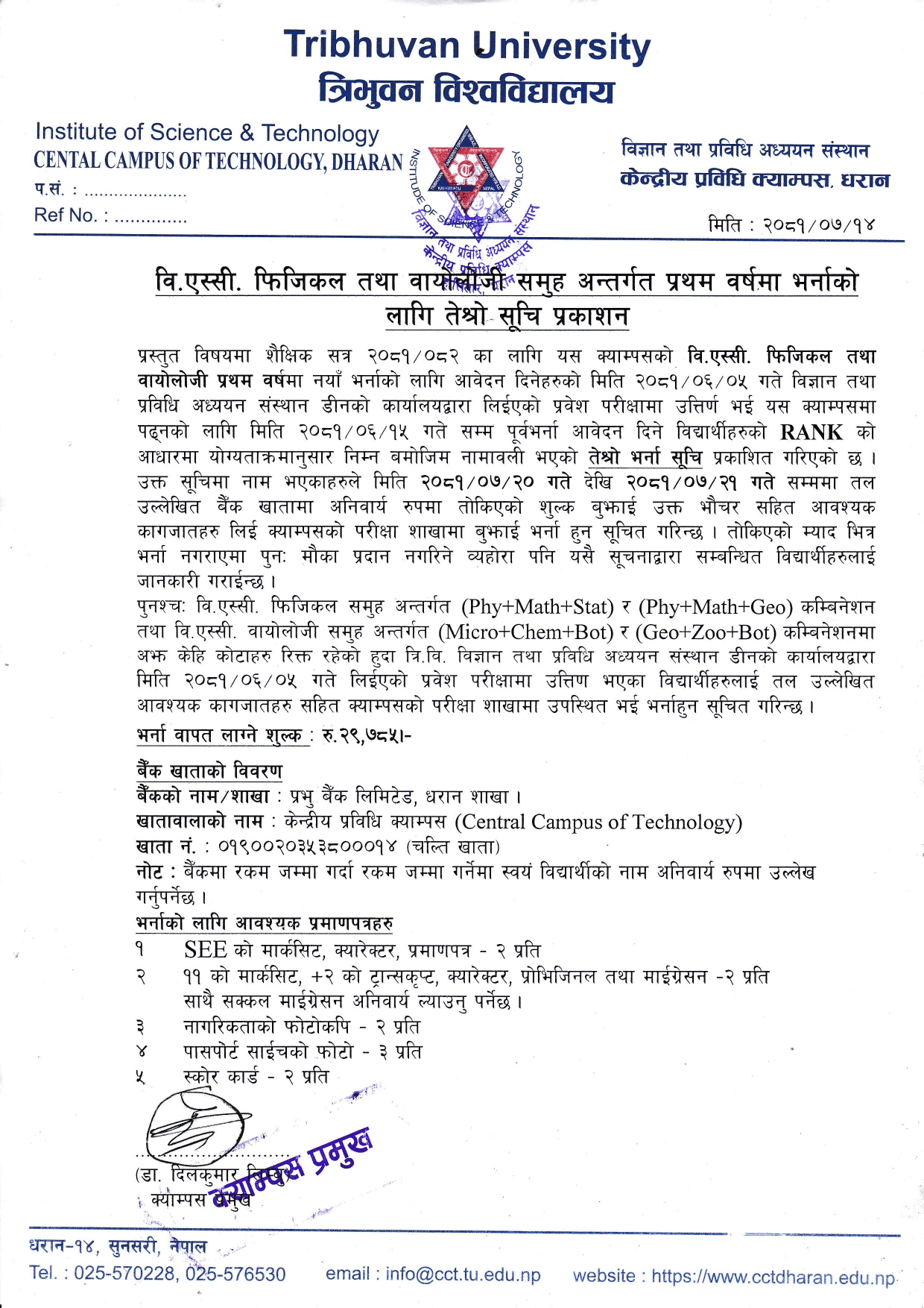 वि.एस्सी. फिजिकल तथा वायाेलाेजी समुह अन्तर्गत प्रथम वर्षमा भर्नाकाे लागि तेश्राे सूचि प्रकाशन ।