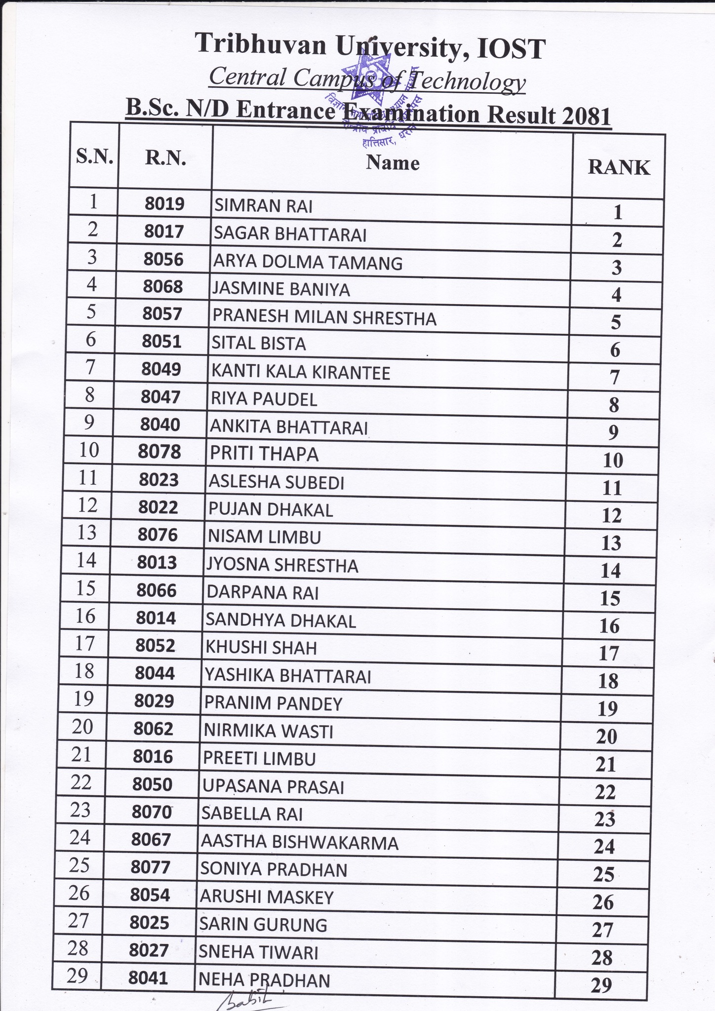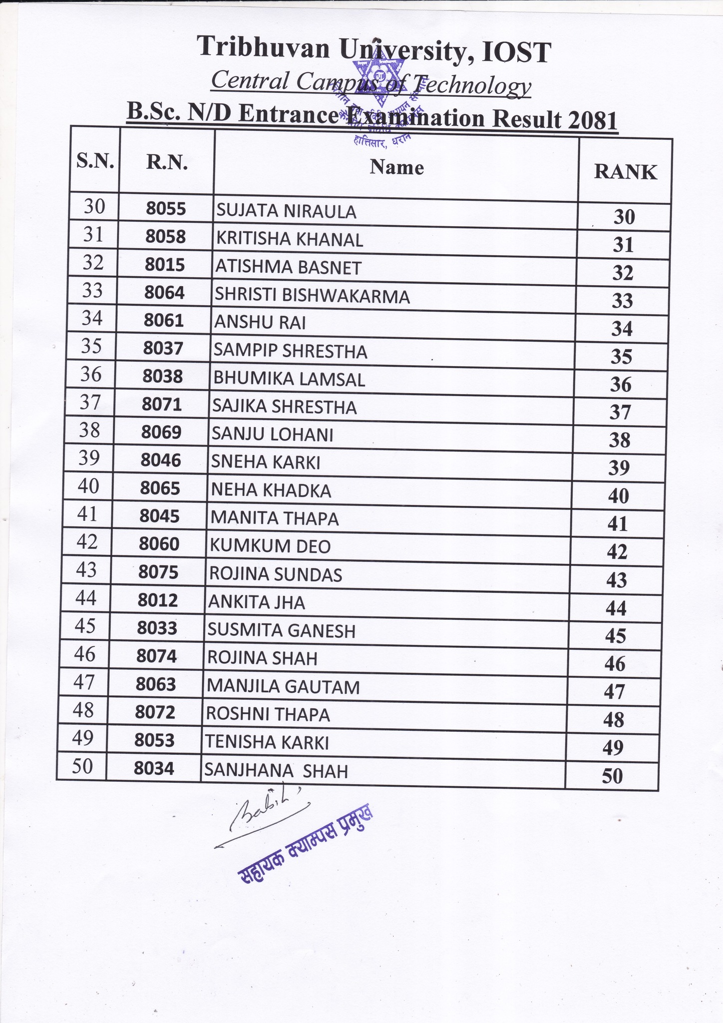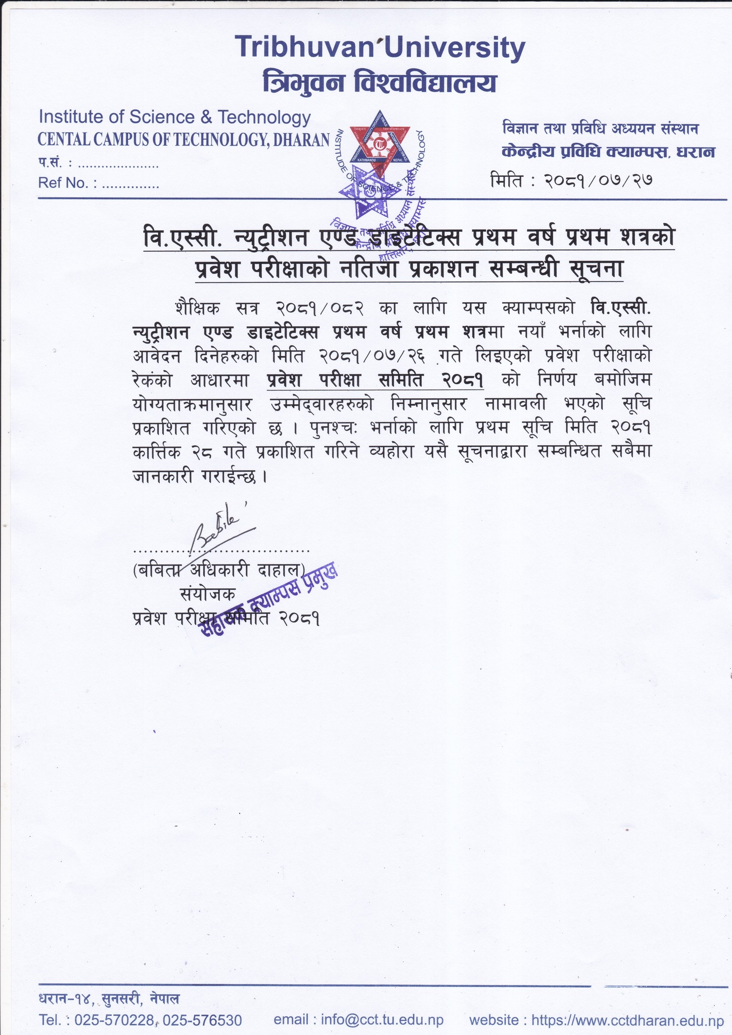 B.Sc.Nutrition & Dietitics Entrance Examination Result 2081