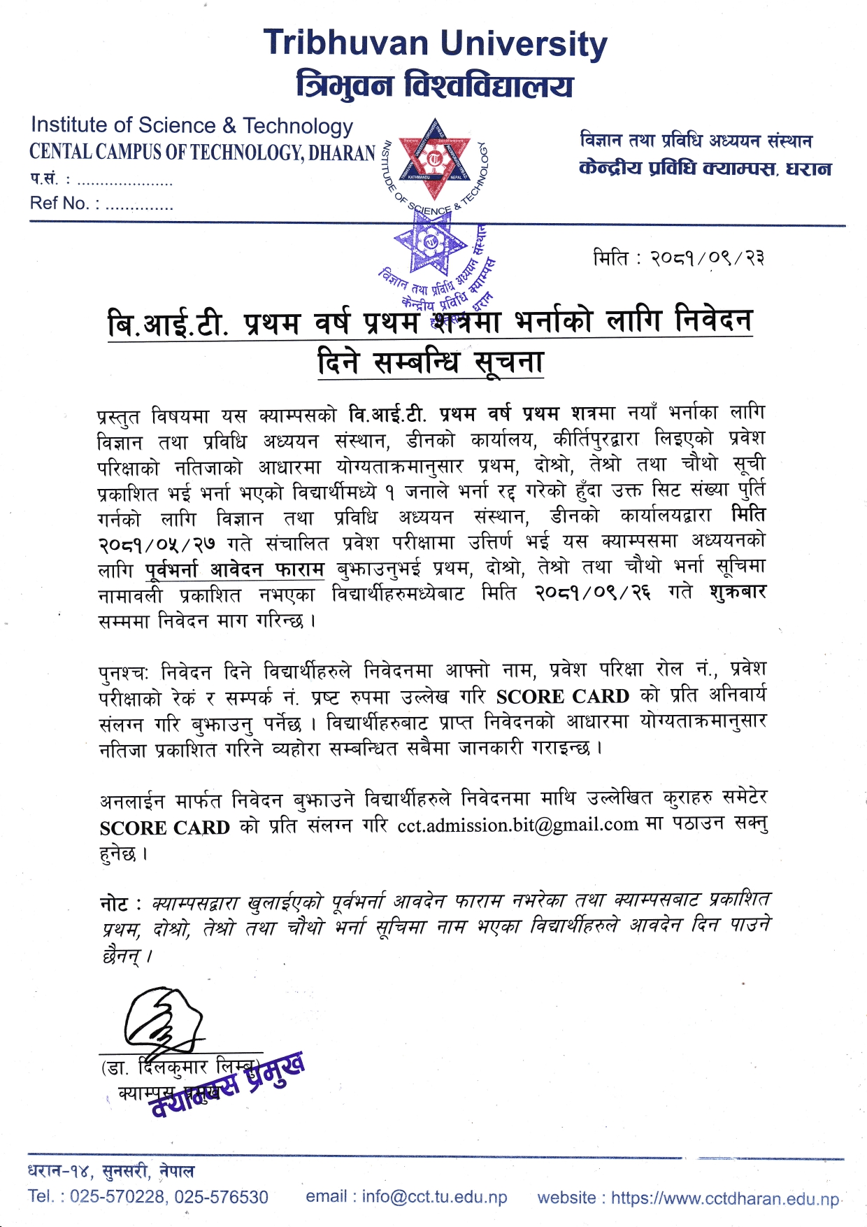 बि.एस्सी. तेश्रो वर्षको भर्ना तथा नियमित कक्षा सम्बन्धी सूचना ।
