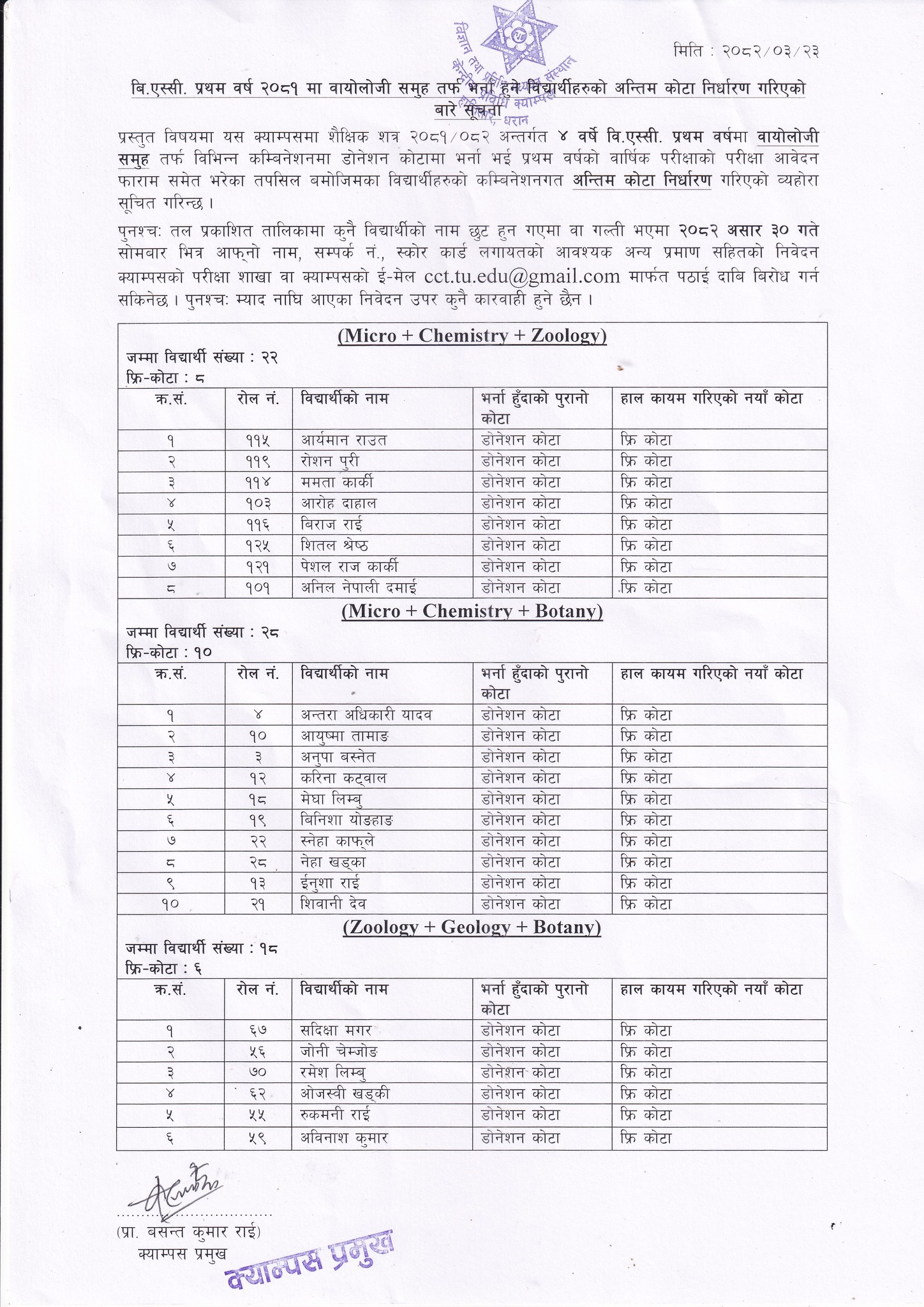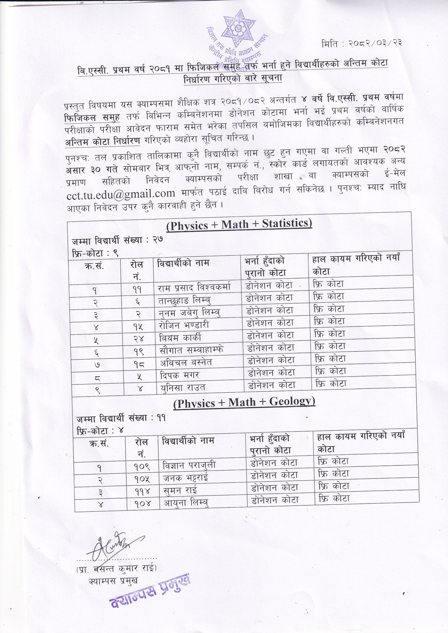 B.Sc. प्रथम वर्ष २०८१ मा भर्ना हुने विधार्थीहरूकाे अन्तिम काेटा निर्धारण बारे सुचना