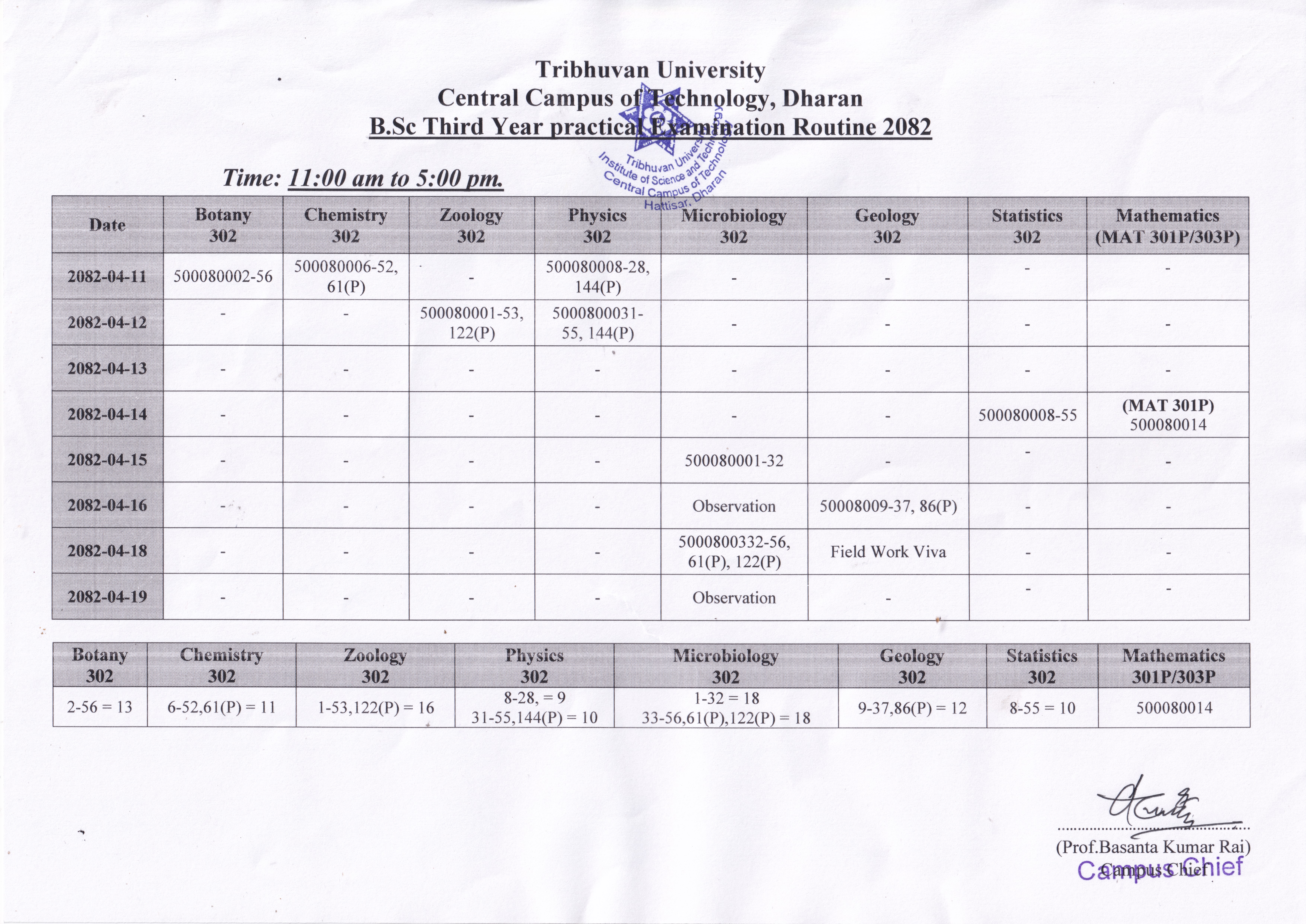 वि.एस्सी. तेश्रो वर्षको प्रयोगात्मक परिक्षाको तालिका ।