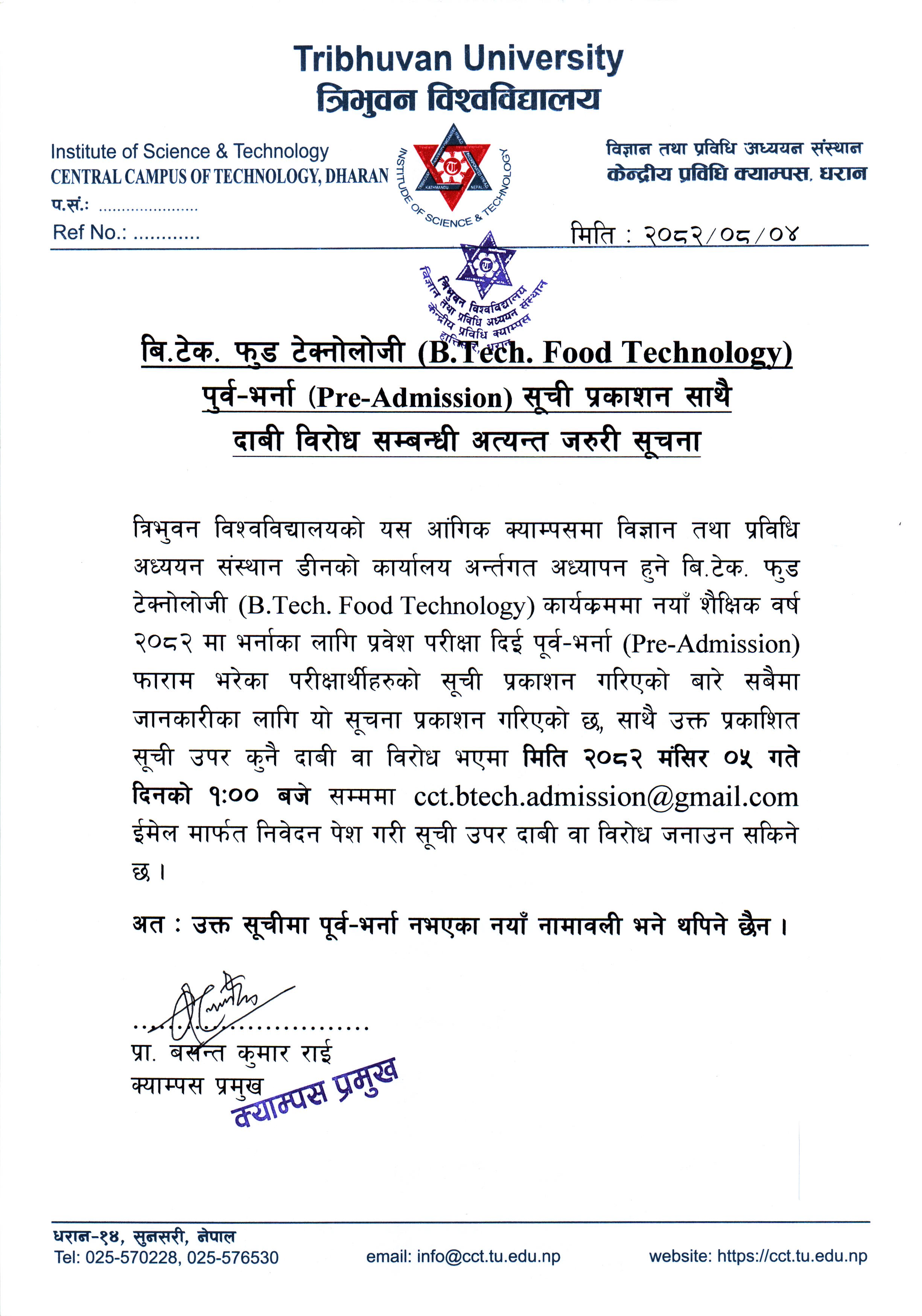 वि.टेक. खाद्य प्रविधि (B.Tech.Food Technology) पूर्व-भर्ना (Pre-Admission) सूची प्रकाशन बारे सूचना ।