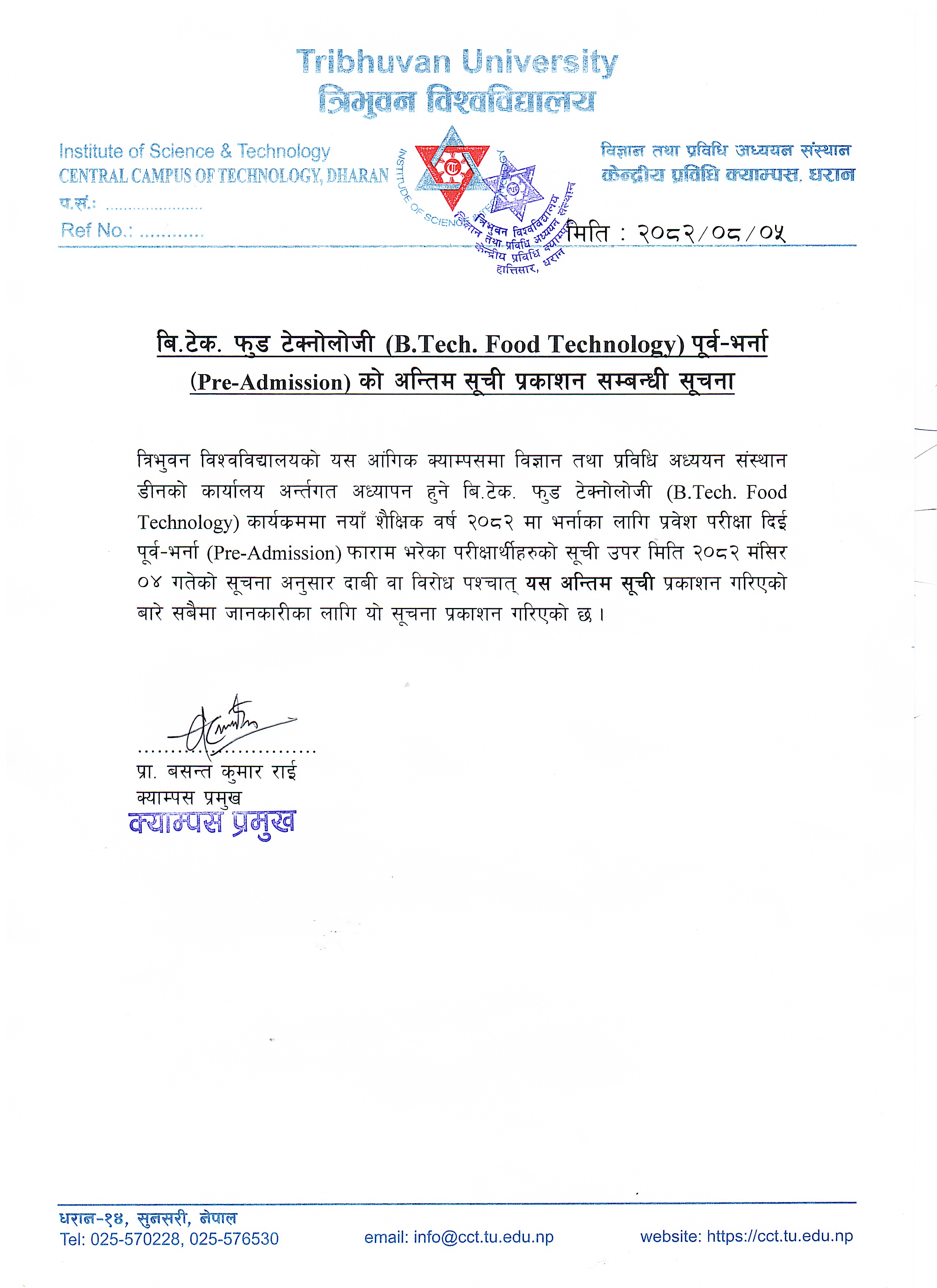 B.Tech (Food Technology) २०८२ Pre-admission काे अन्तिम सुची प्रकाशन बारे सुचना ।
