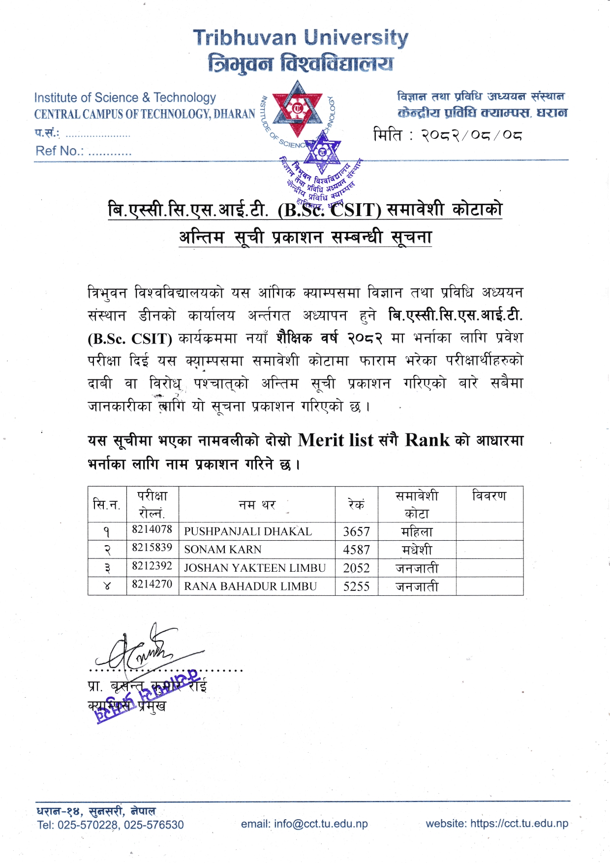 बि.एस्सी. सि.एस.अइ.टी. समावेशी काेटाकाे अन्तिम सूची प्रकाशन सम्बन्धी सूचना ।